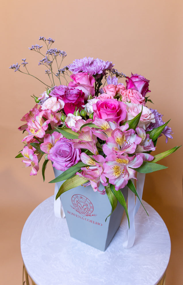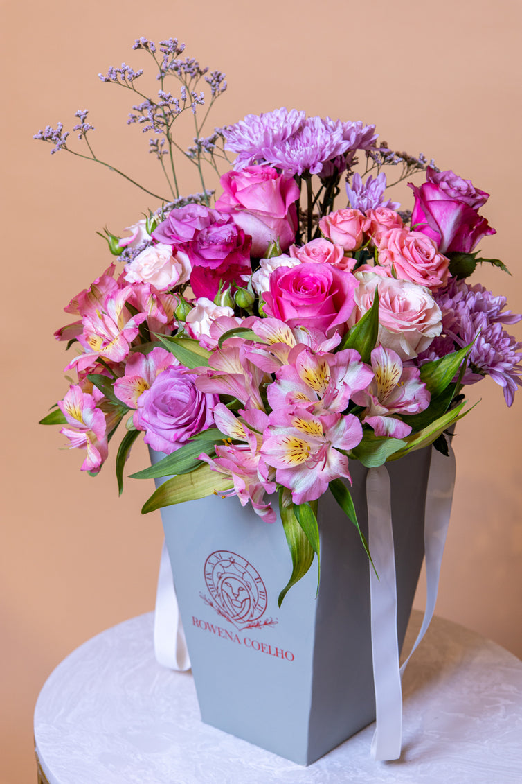 An easy-to-carry bag arrangement consisting of a medley of the season’s finest pink, purple and lilac florals. The statuesque bag with Grosgrain ribbon handles adds a sculptural appeal to a room. The bouquet pictured above is the “Medium” size.