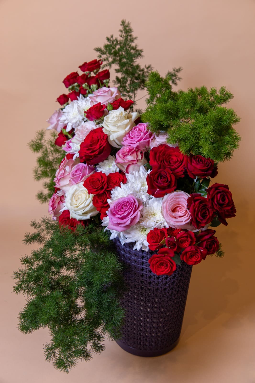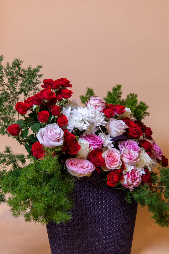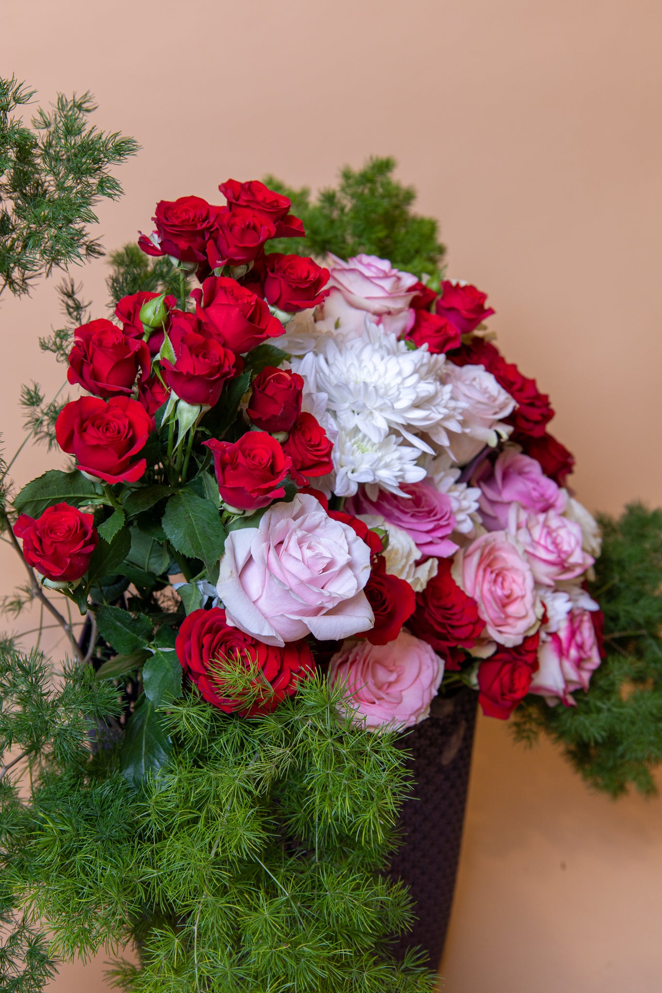 An impressive cascade of the season’s finest, most opulent red, pink and white blossoms arranged in a captivating tall basket to add a singular appeal to a room. A tall arrangement wearing a crown of fine botanicals, this luxury bouquet instantly bring a space to life by adding a unique warmth and charm. In a home, let it greet visitors with a few carefully-chosen trinkets at the base and watch the admiration light up your guests’ eyes.