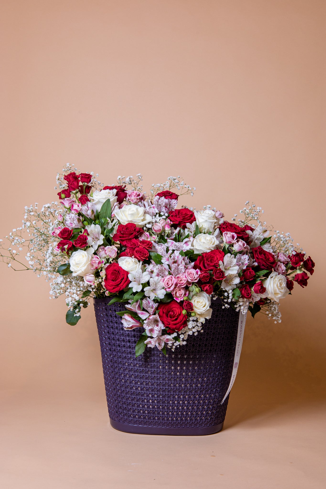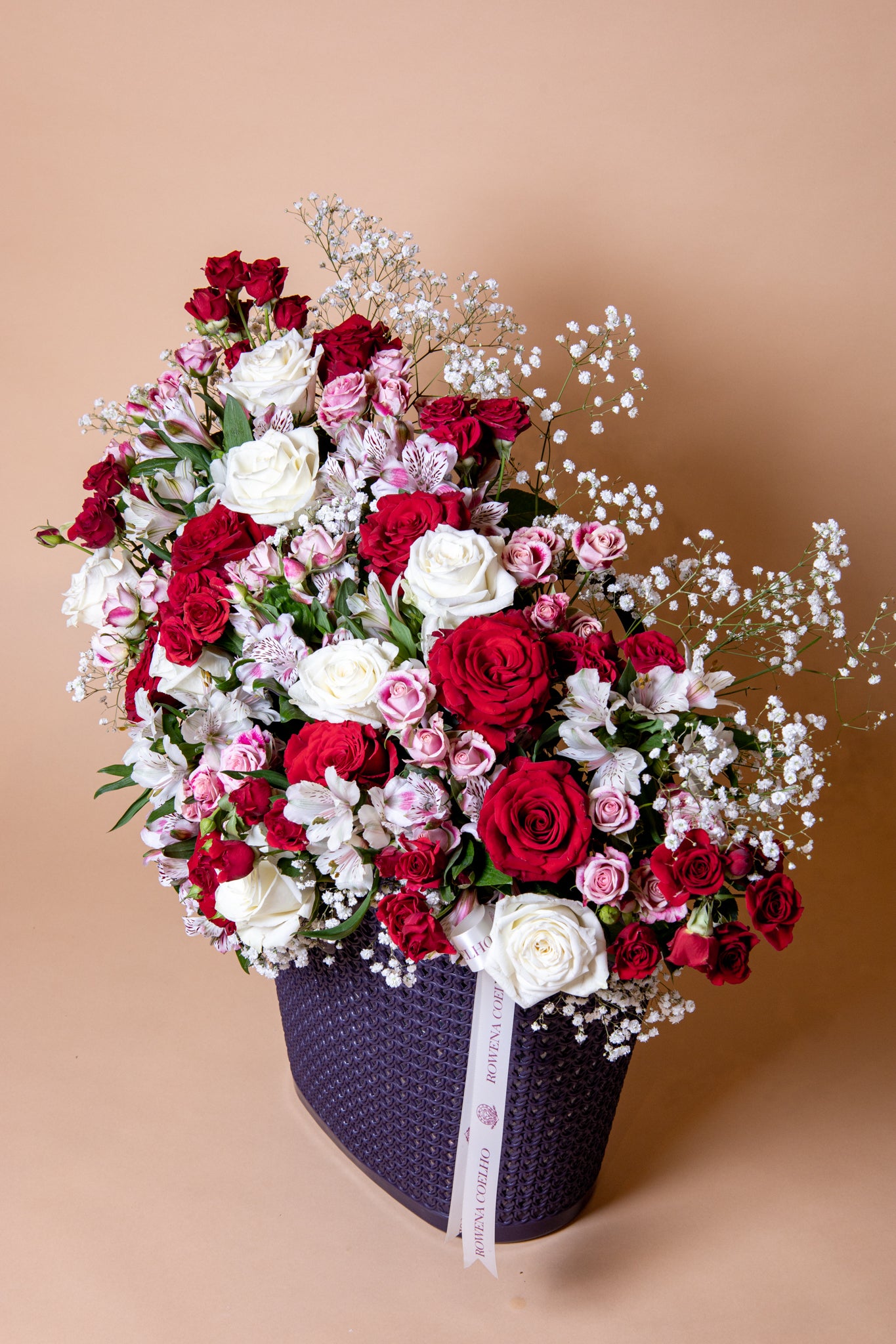 An impressive assortment of the season’s finest, most elegant red, pink and white blooms arranged in an alluring tall basket to add a whimsical appeal to a room. A tall arrangement wearing a crown of fine botanicals, this luxury bouquet instantly bring a space to life by adding a unique warmth and charm. In a home, let it greet visitors with a few carefully-chosen trinkets at the base and watch the admiration light up your guests’ eyes.