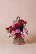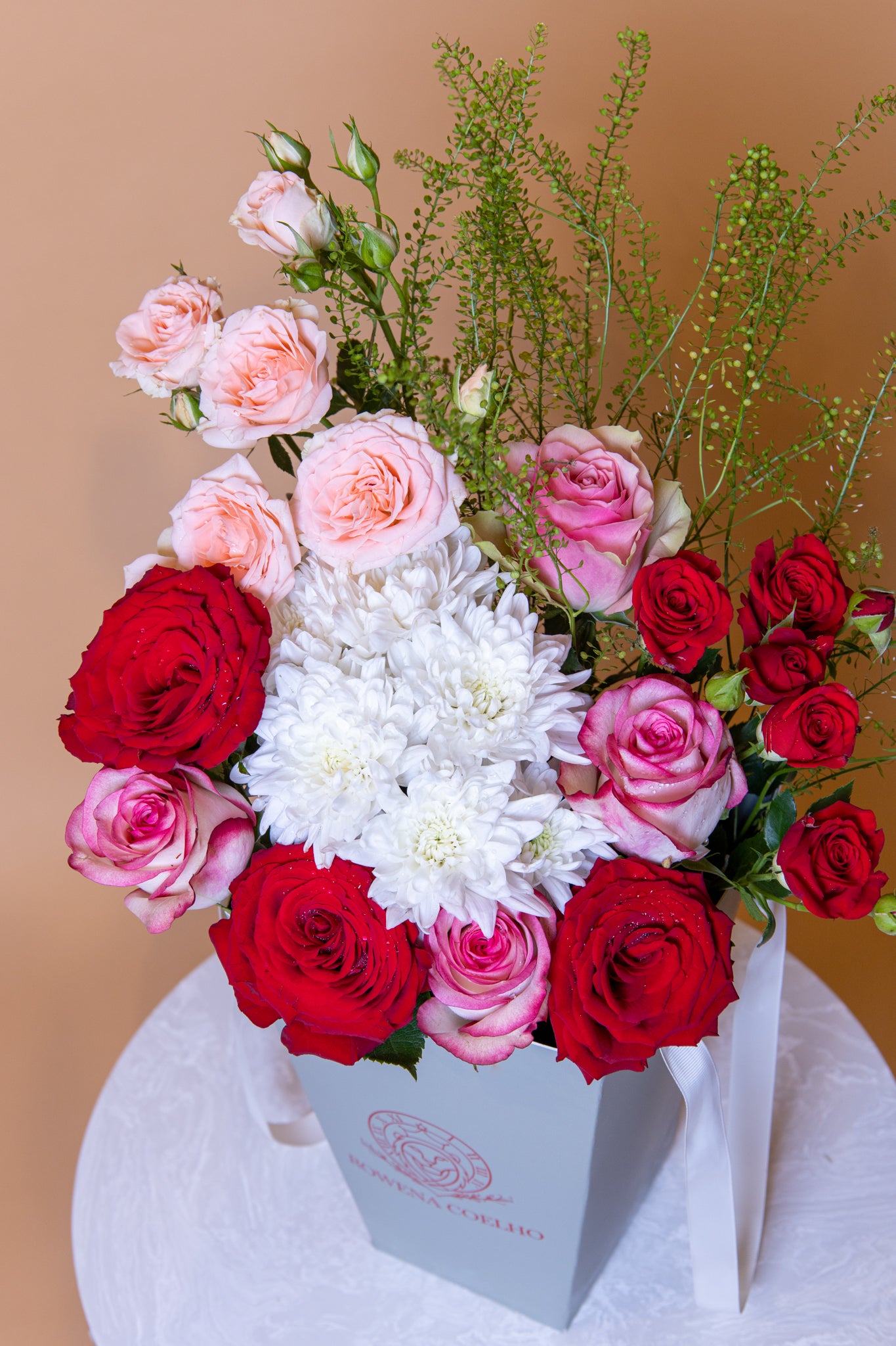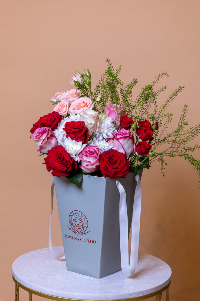 An easy-to-carry shaped bag arrangement consisting of an assortment of the season’s finest pink, red and white blossoms. The elegant bag with grosgrain ribbon handles adds a sculptural appeal to a room. The bouquet pictured above is the “Medium” size.