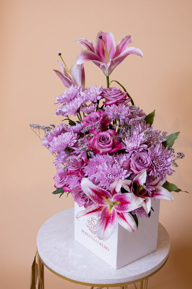 The trendy box bouquet gets a unique transformation with Rowena Coelho’s inimitable style. Make your space the talk of the town with this bouquet of fresh, seasonal lilac and pink coloured flowers. The bouquet pictured above is the “Small” size.