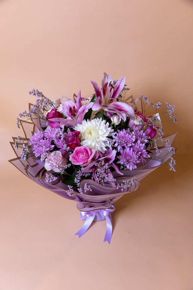 A bushy bouquet of fresh seasonal blooms in shades of pink, purple and white. With its classic round form factor, it looks equally at home in your arms as on a table. The bouquet pictured above is the “Medium” size.