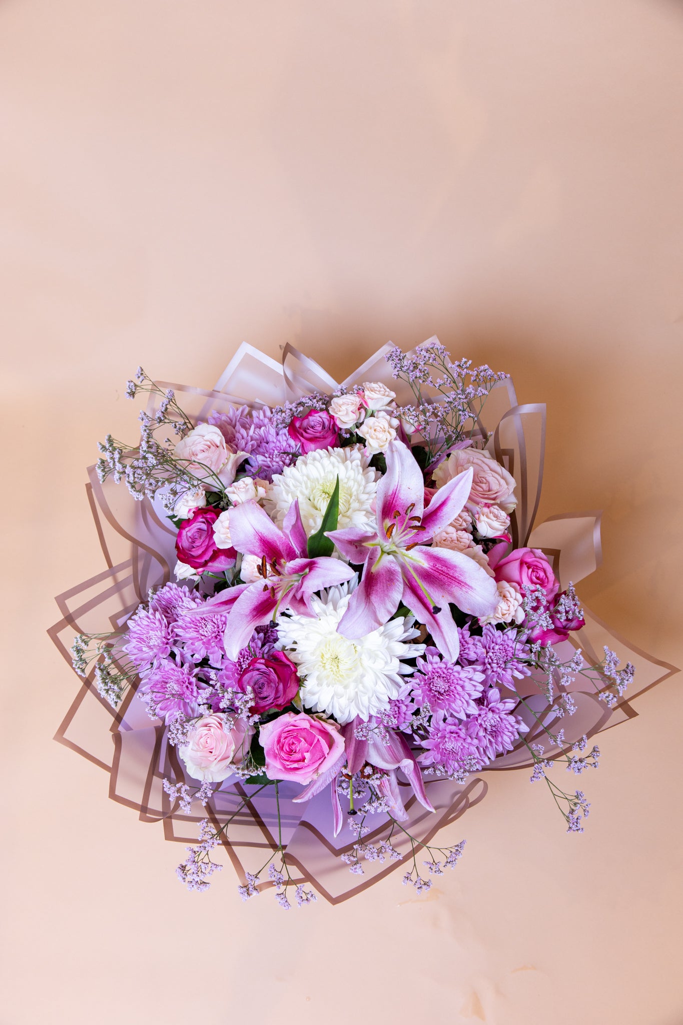- TYPE OF FLOWERS USED : Lilies, roses, spray roses and limonium.