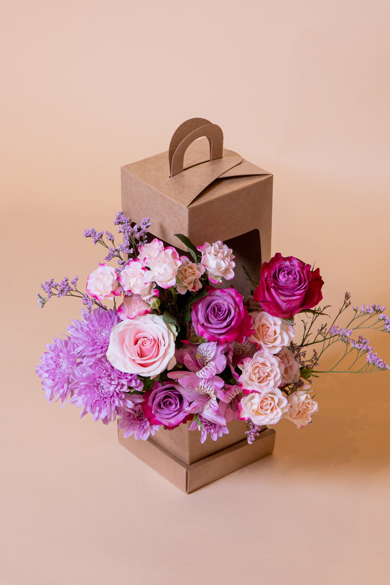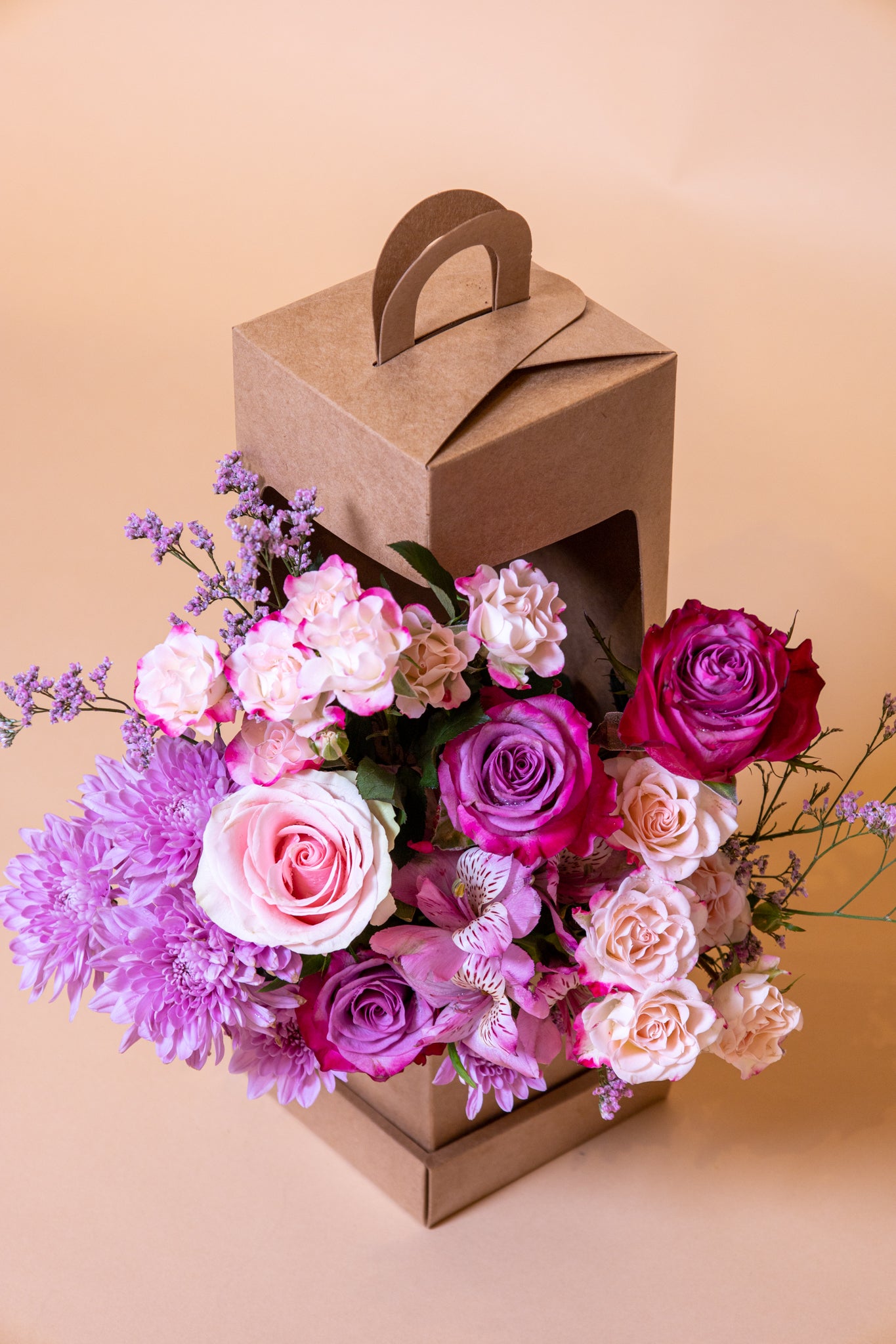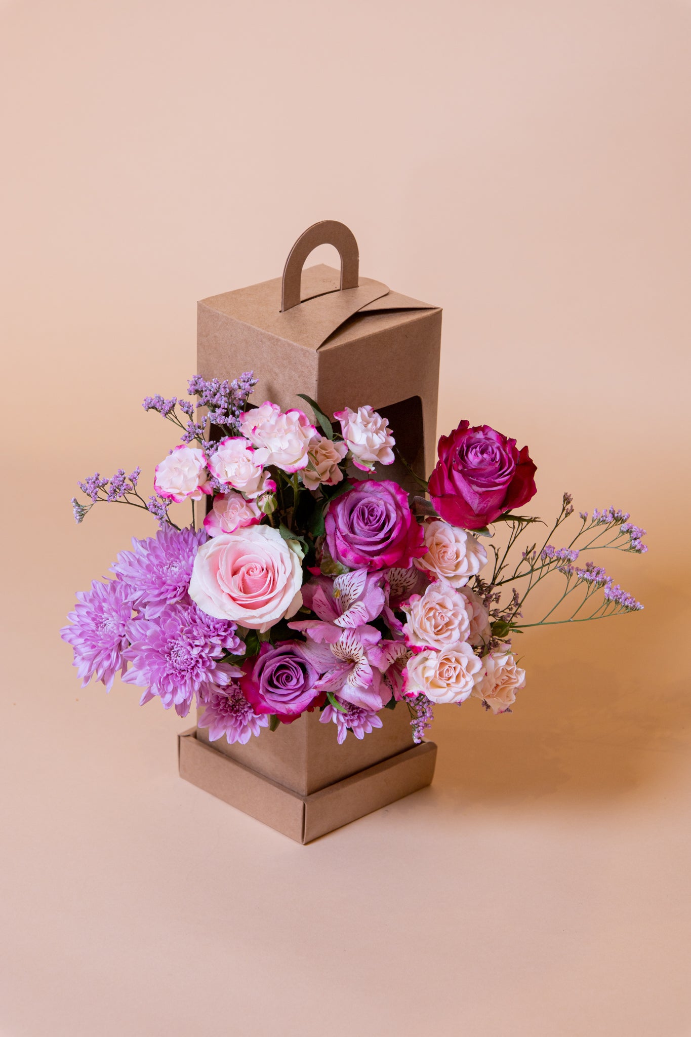 A unique take on the stylish box bouquet. A variety of the season’s finest lilac coloured and pink florals arranged in a lantern-shaped box. Brighten up your space with this beacon of sophistication.