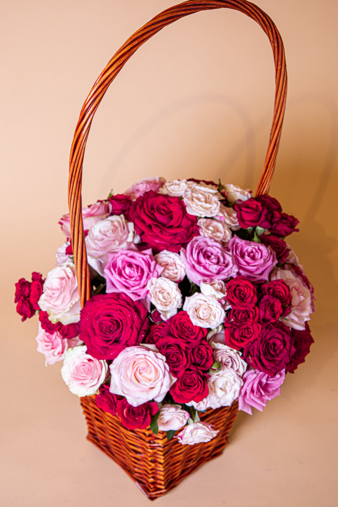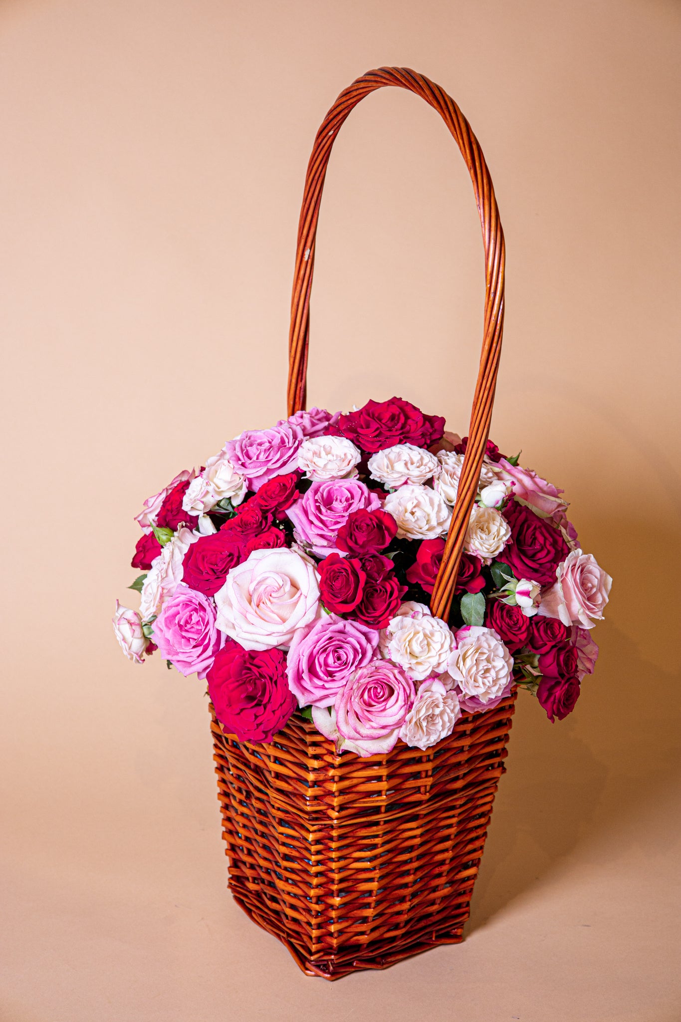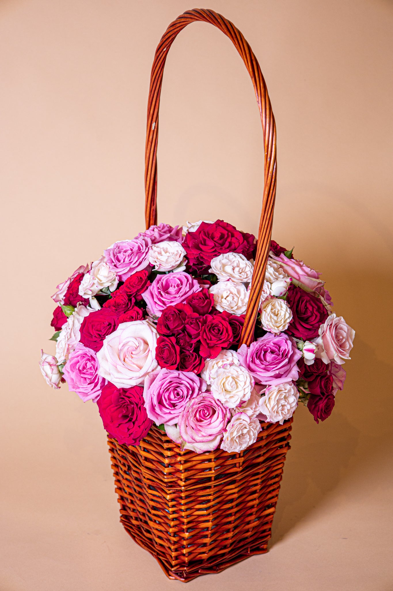 Bring home some nostalgic charm with this cottagecore bouquet of fresh, seasonal white-pink, blushing pink and scarlet blooms arranged in a charming vintage-style wicker basket. This arrangement brings the unspoiled charm of nature into your space, signals simple elegance that is deeply intertwined with the elements. The flower arrangement pictured above is the “Small” size.