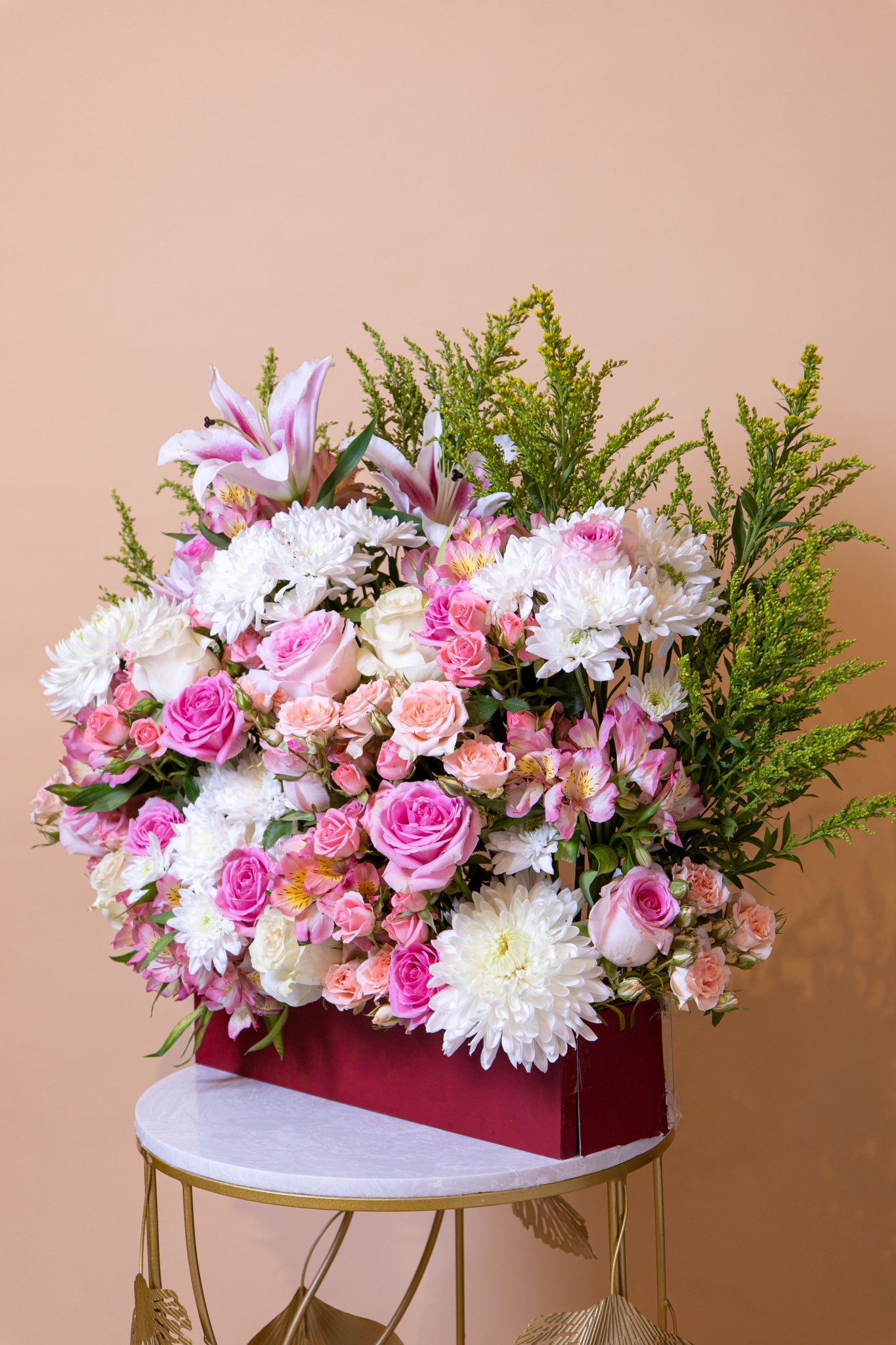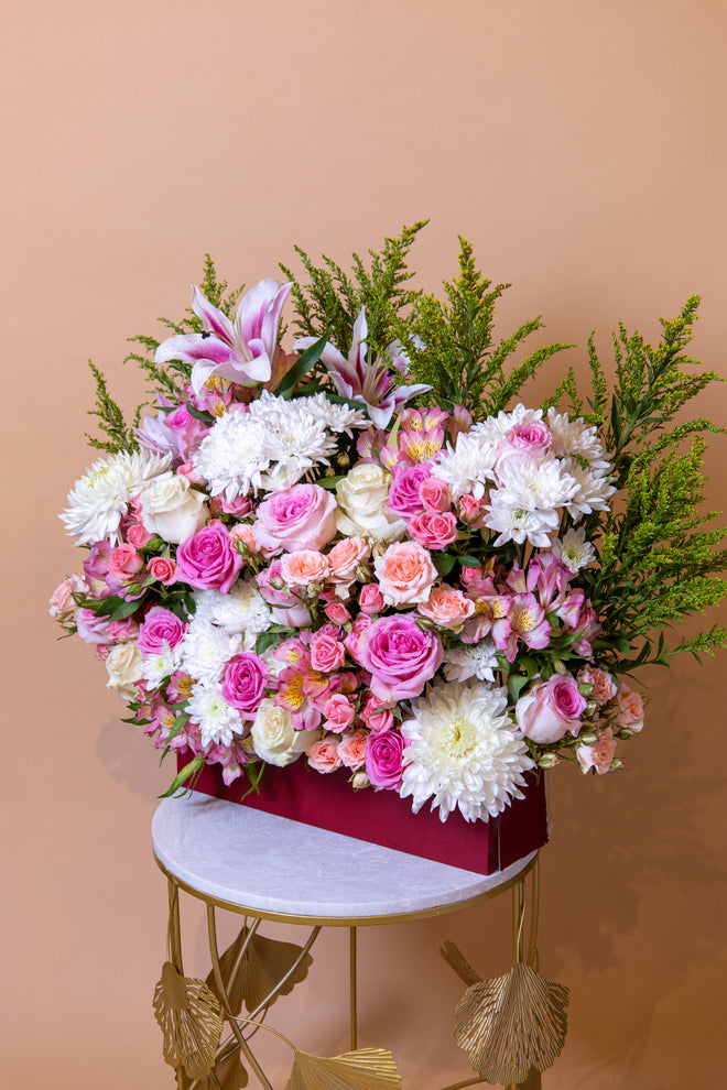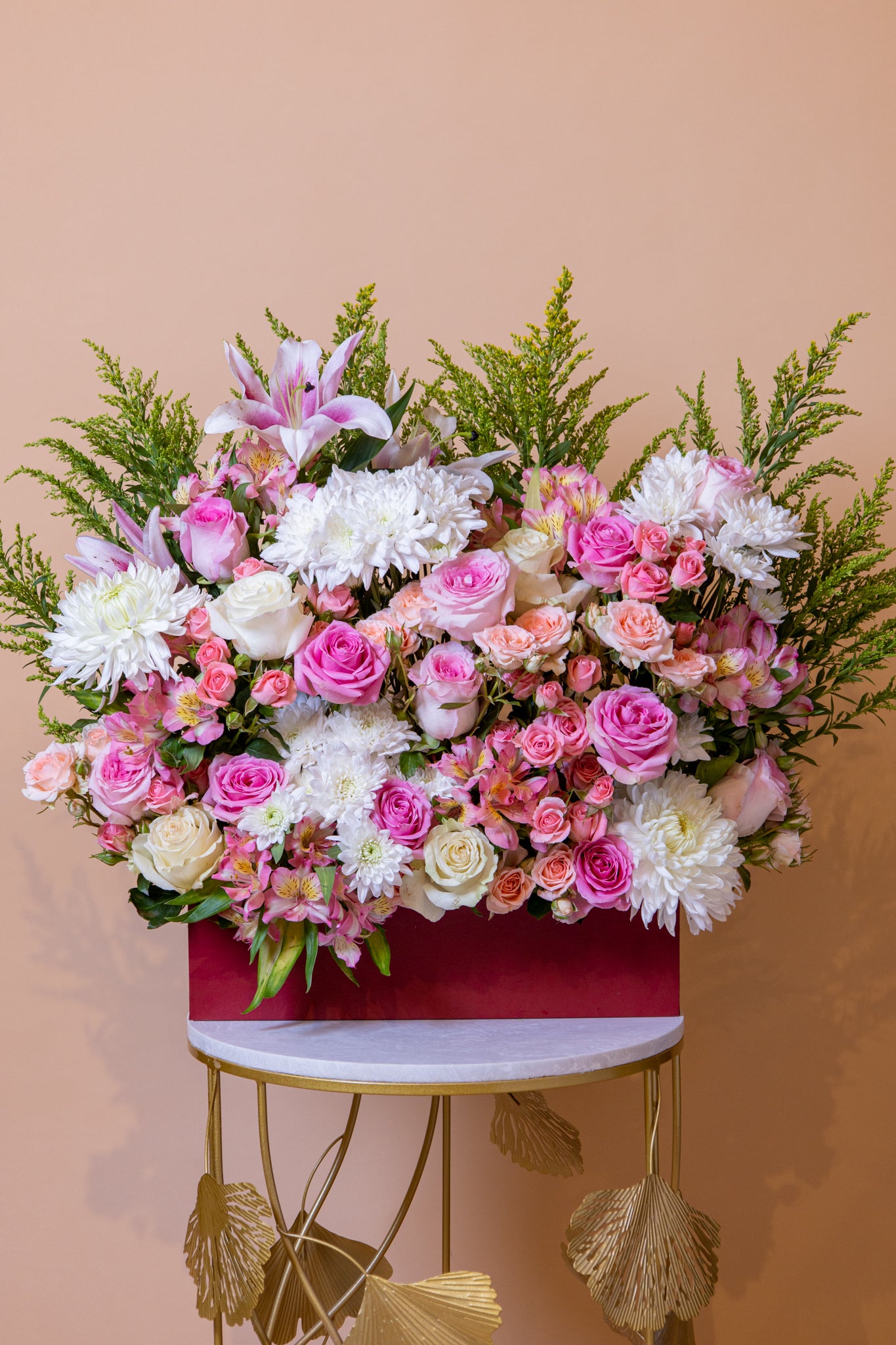 A memorable profusion of the season’s finest, most gracious pink, white, apricot and lilac-coloured flowers. This deluxe box-style arrangement epitomizes haute couture and signals your fashion-first approach to all. A picturesque arrangement sure to enchant. The flower arrangement pictured above is the “Medium” size.