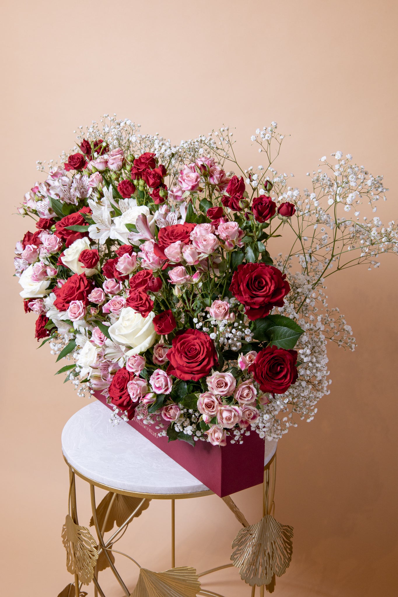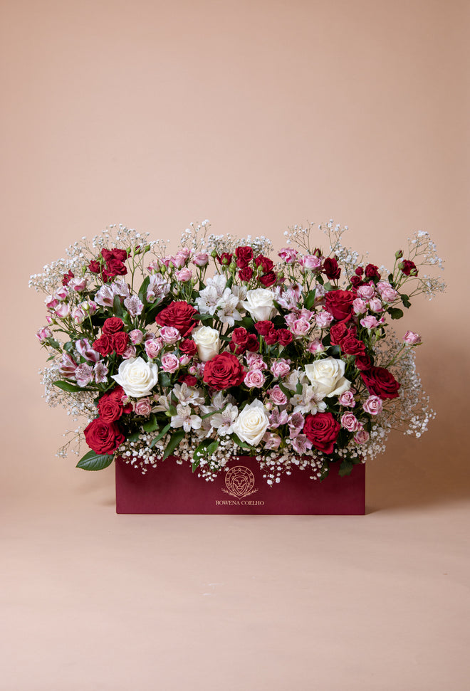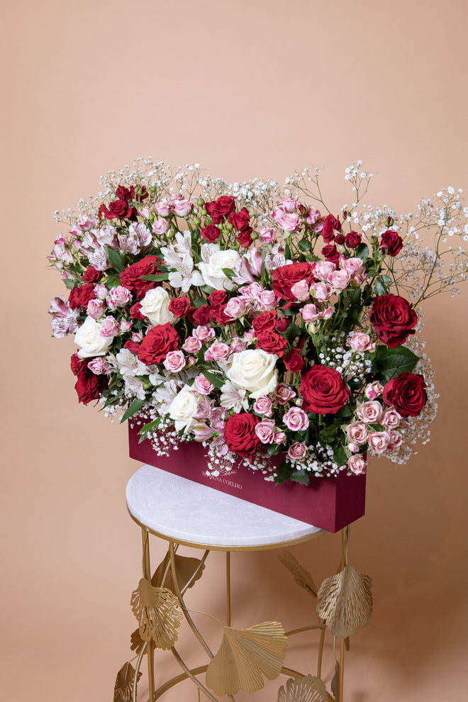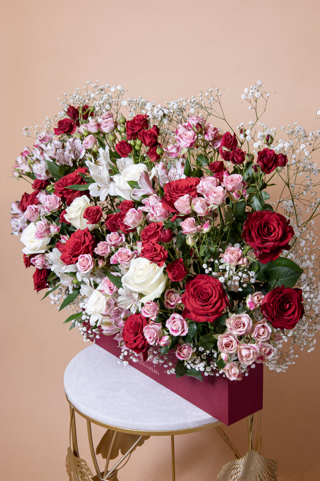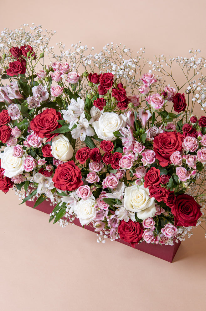 An unforgettable cornucopia of the season’s finest, most sumptuous red, pink and white blooms. This deluxe box-style arrangement epitomizes haute couture and signals your fashion-first approach to all. An impressive arrangement sure to fascinate. The flower arrangement pictured above is the “Medium” size.